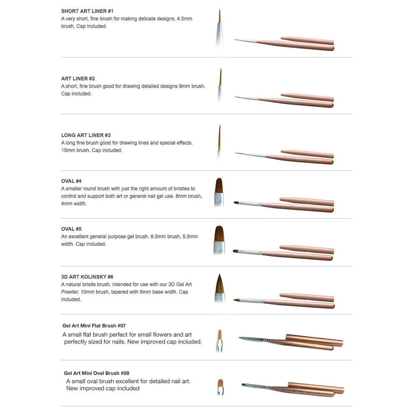 All Akzentz Gel Art Brushes come in 8 different shapes/sizes perfect for all you gel art needs!