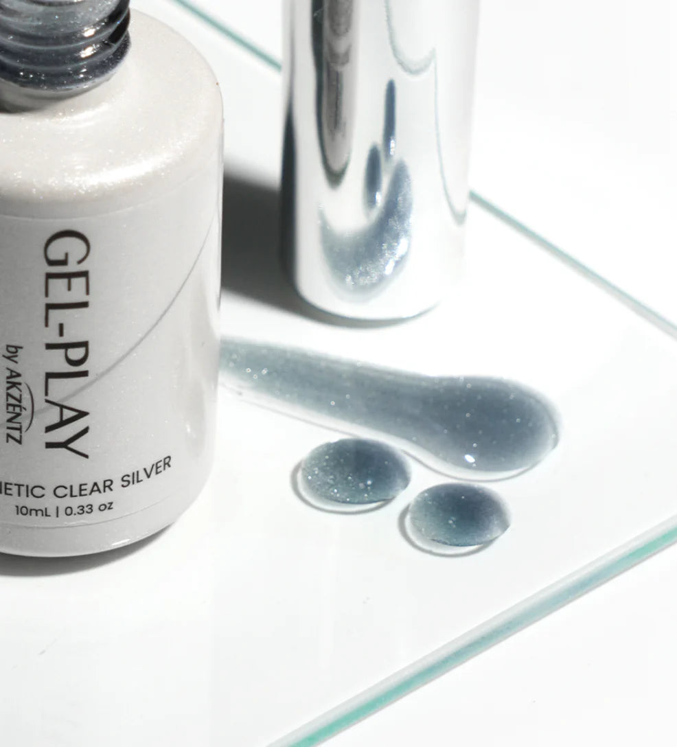 Clear Silver transforms with a magnet to create soft, dimensional and elegant cat-eye effects — designed to layer over any colour for a luminous finish or wear alone for a