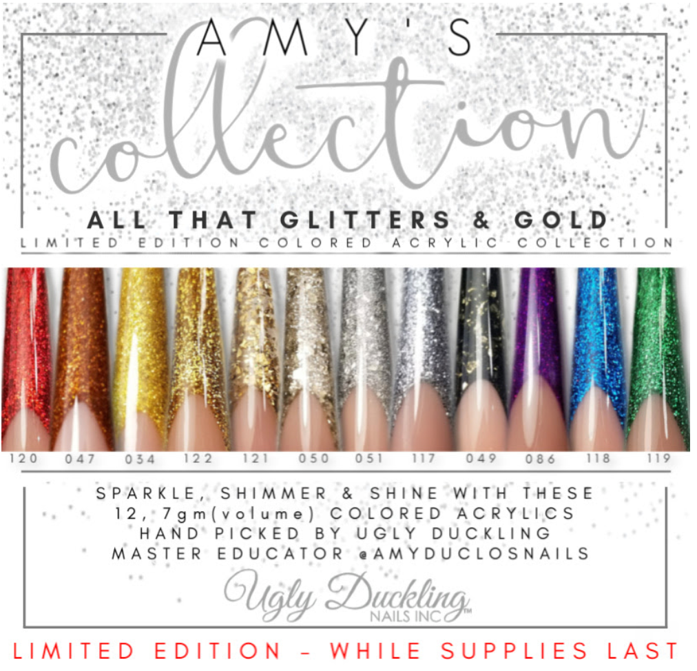 A sampling of Ugly Duckling Master Educator @amyduclosnails favorite sparkle colors chosen from our complete collection. Sparkle, shimmer and shine with these 12 x 7gm (volume) hand-picked colored acrylics.