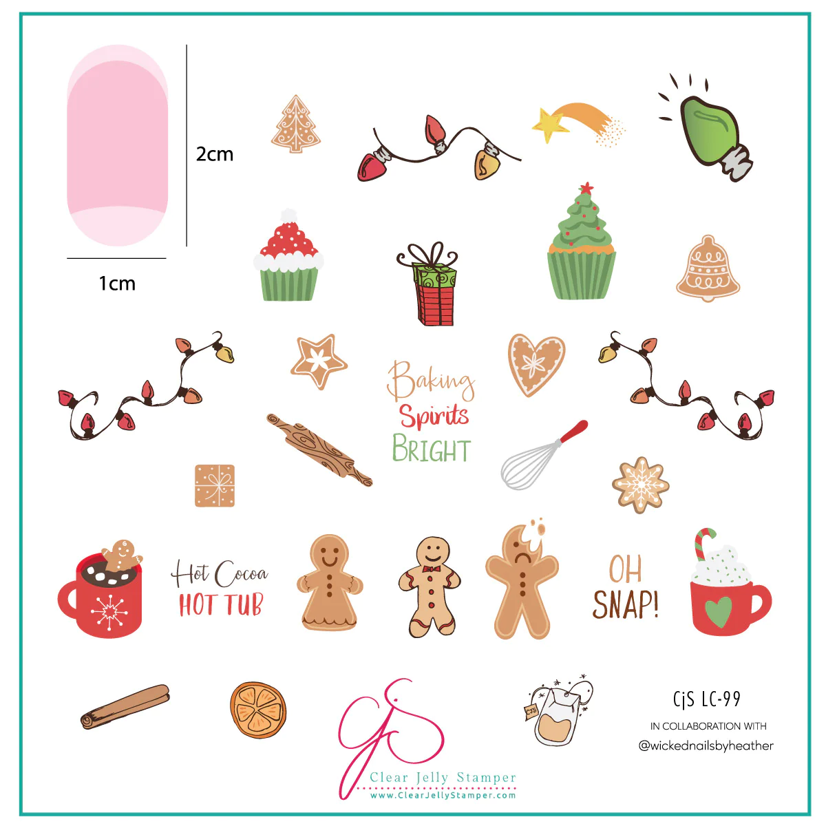 Unleash your inner holiday baker with the CjSLC-99 "Baking Spirits Bright" Steel Nail Art Layered Stamping Plate. This delightful plate brings the festive charm of holiday baking straight to your nails. It features delectable images of Christmas trees and star-shaped cookies, adorned with sparkling icing, along with gingerbread men. The plate also celebrates the cozy side of Christmas with hot cocoa, candy canes, and essential baking tools like a whisk and rolling pin. A string of Christmas lights adds an extra dash of holiday cheer, alongside neatly wrapped presents and the zesty scent of sliced oranges. Cupcakes are artfully showcased, bringing a touch of sweetness to your nail art. And of course, who can resist the whimsical "Oh snap!" message, capturing the light-hearted spirit of holiday baking? "Baking Spirits Bright" is your ticket to creating nails that are as delicious as they are festive, capturing the warmth and joy of the holiday season with every stroke. So roll up your sleeves, grab your favorite recipes, and bake your way to stunning holiday nail art with this delectable plate.