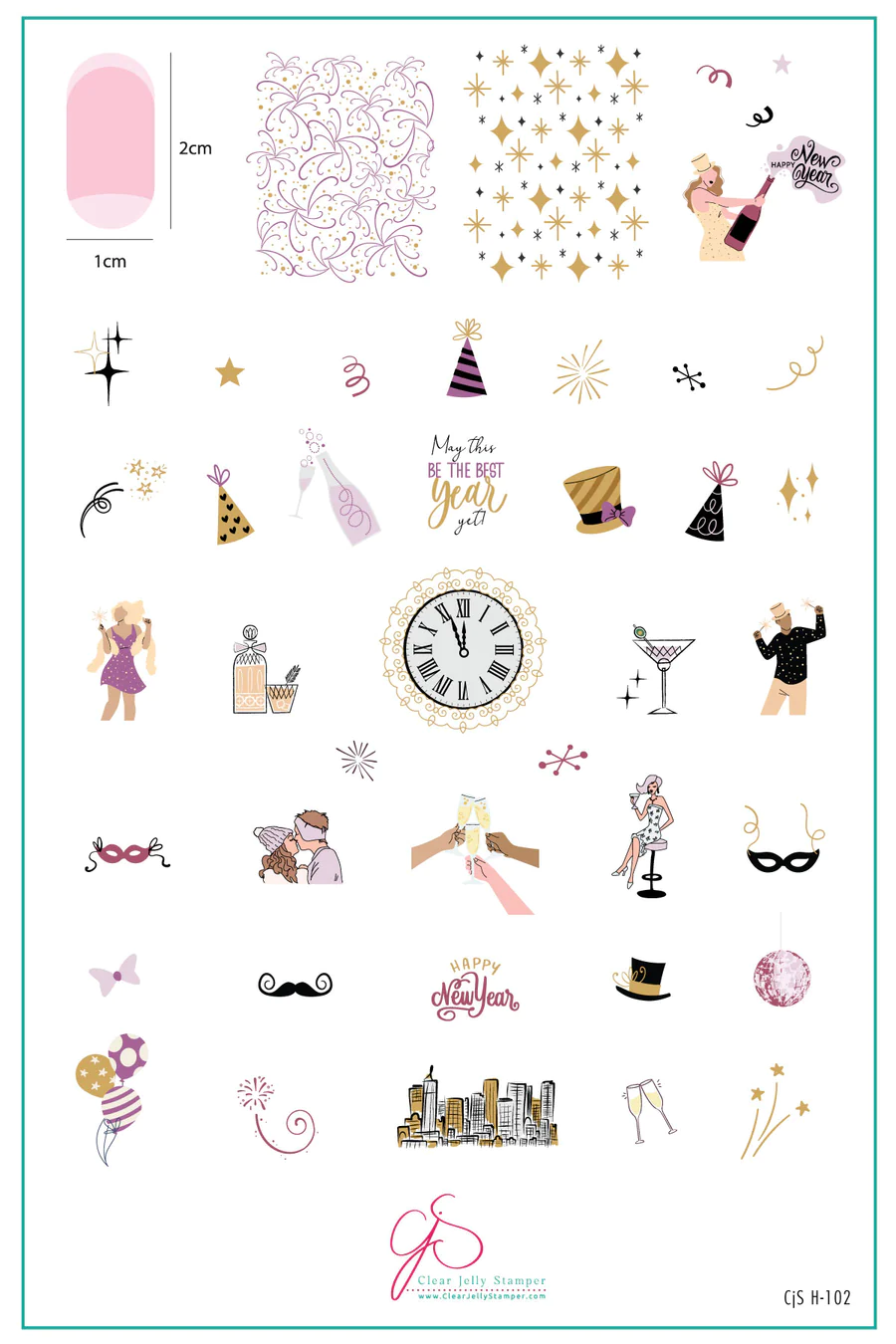 Dive into the festive chaos of a New Year's bash with the Clear Jelly Stamper steel nail art layered stamping plate, "Best Year Yet! CjSH-102." It's a party on a plate, bursting with the whimsy of midnight madness! Sip on champagne bubbles while fireworks explode in vibrant patterns across the skyline. Feel the rush of midnight kisses under a canopy of balloons, where party hats meet masked mischief-makers in a whirlwind of celebration. Capture the dance floor vibes and clinking cocktail glasses, all leading up to the electrifying countdown to midnight. With this plate, your nails become the canvas for the ultimate New Year's extravaganza—each design is an invitation to join the most epic party at your fingertips!