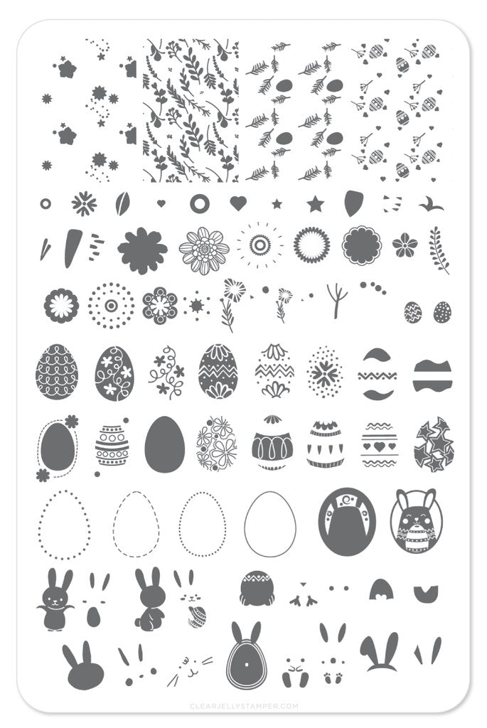 Cute bunnies, loads of layer-able eggs and beautiful full coverage designs make this an Easter MUST have plate!