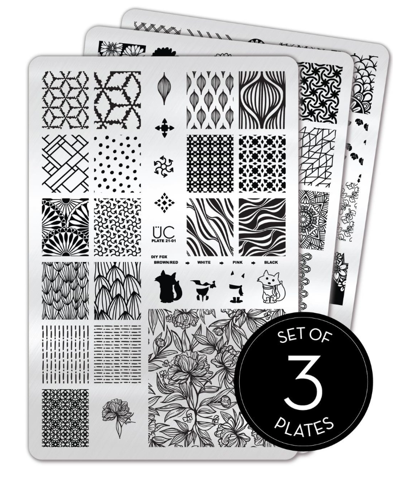 This Collection features three of our unique design plates carefully made to ensure almost any size nail is accommodated, it includes: UC 21-01, UC 21-02, and UC 21-03