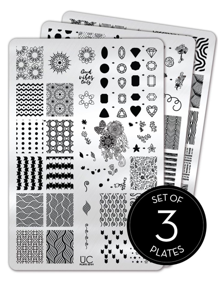 This Collection features three of our unique design plates carefully made to ensure almost any size nail is accommodated, it includes: UC 22-01, UC 22-02, and UC 22-03