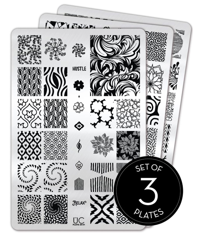 This Collection features three of our unique design plates carefully made to ensure almost any size nail is accommodated, it includes: UC 25-01, UC 25-02, and UC 25-03