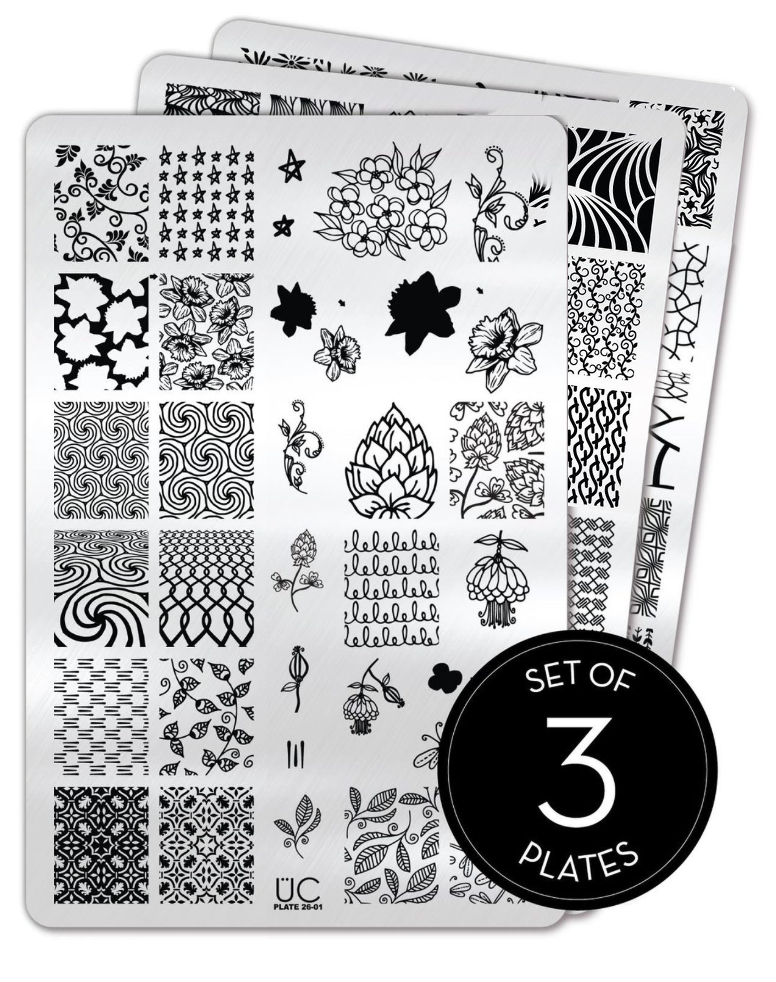 This Collection features three of our unique design plates carefully made to ensure almost any size nail is accommodated, it includes: UC 26-01, UC 26-02, and UC 26-03