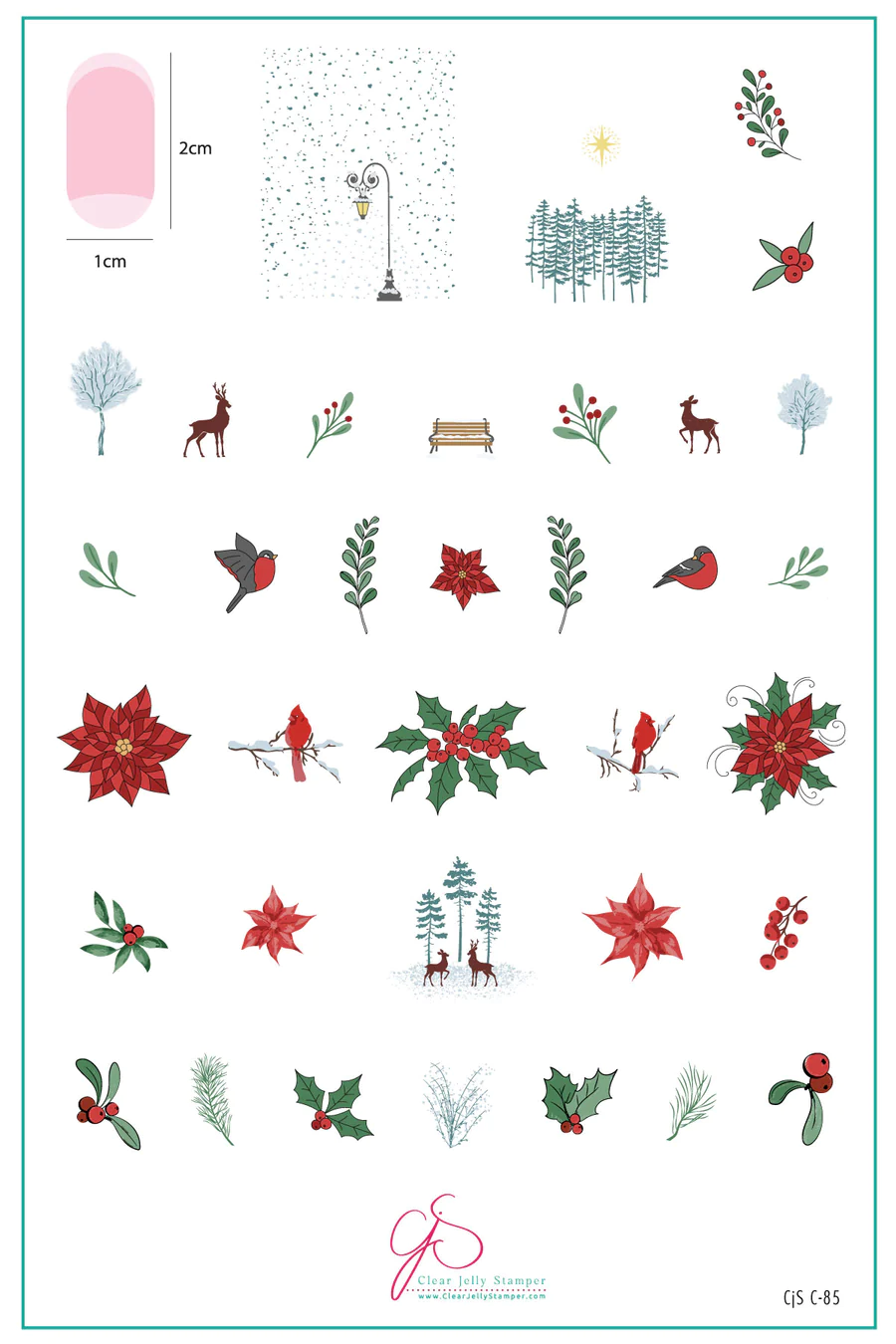 Introducing the CjSC-85 "Debbie's Fav's" Steel Nail Art Layered Stamping Plate, a captivating winter wonderland at your fingertips. This enchanting plate is a tribute to the season's most beloved elements, featuring intricate layers of snowfall, delicate poinsettias, charming birds perched on branches, graceful deer in a tranquil forest, and the iconic white trees that paint a winter landscape. In the spirit of Christmas, this plate offers festive imagery such as cheerful robins, holly branches adorned with berries, sparkling stars, and a cozy street lantern that lights up your nails with holiday magic. Additionally, the plate showcases detailed fern patterns, bringing a touch of elegance to your winter-inspired nail art creations. With "Debbie's Fav's," you can effortlessly transform your nails into a picturesque winter scene, making every day feel like a snowy Christmas wonderland.