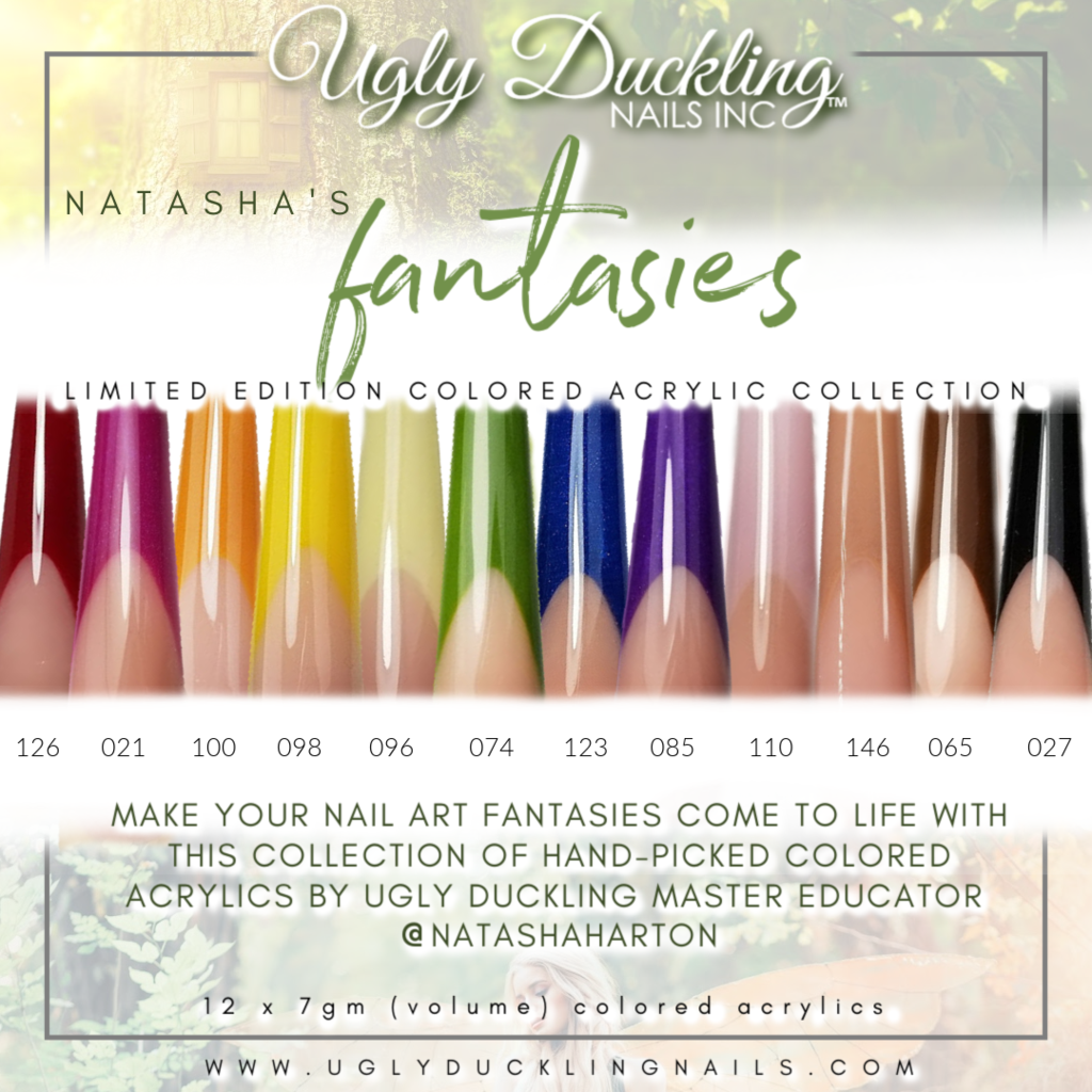 A sampling of Ugly Duckling Family Member @natashaharton favorite fantasy and 3D colors chosen from our complete collection. Make your nail art fantasies come to life with these 12 x 7gm (volume) hand-picked colored acrylics.