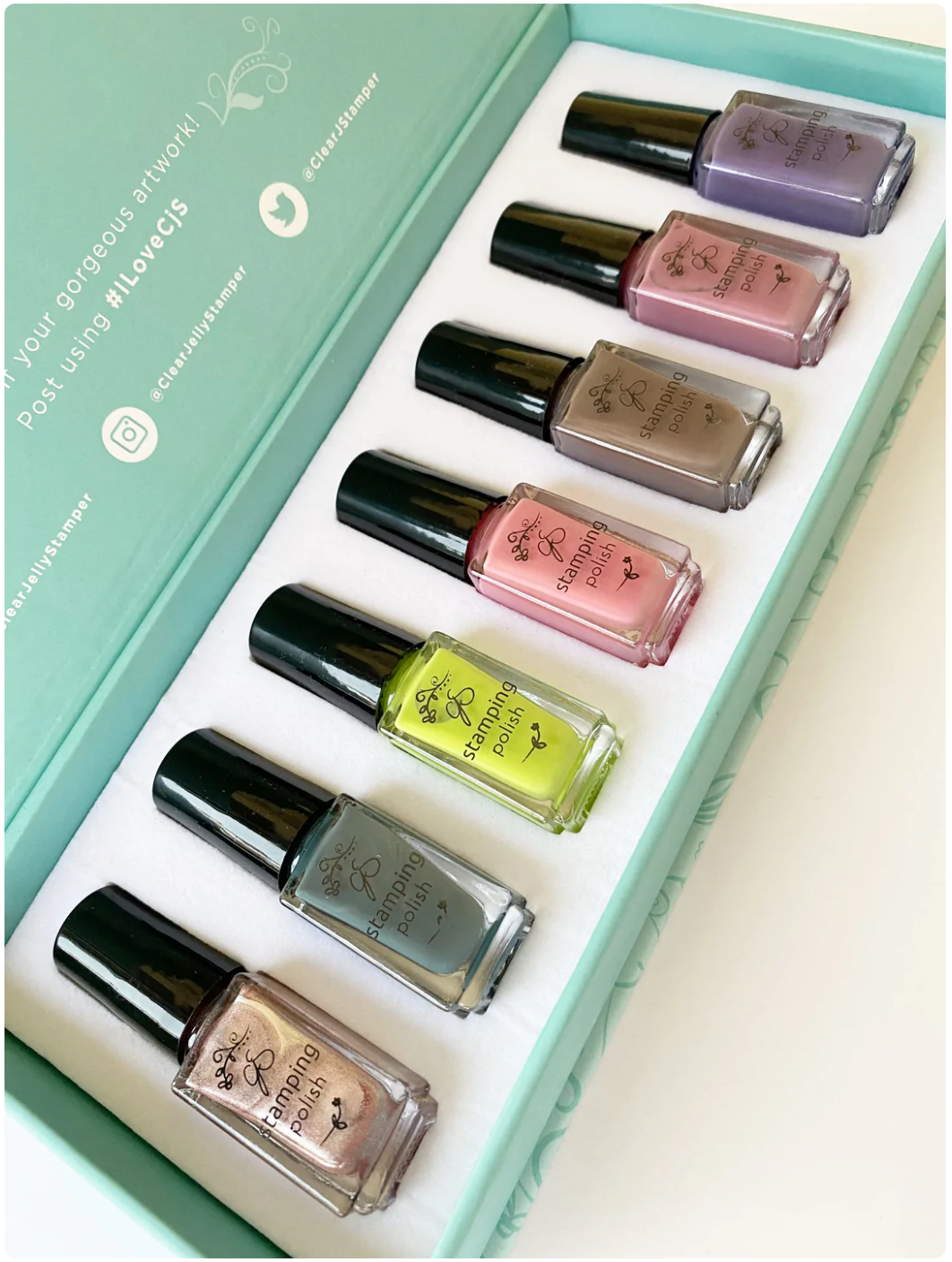 Cjs Stamping polish is specifically formulated for the clear stamper. Hyper Pigmented polish also works nicely as nail polish! Most colors cover in one coat!