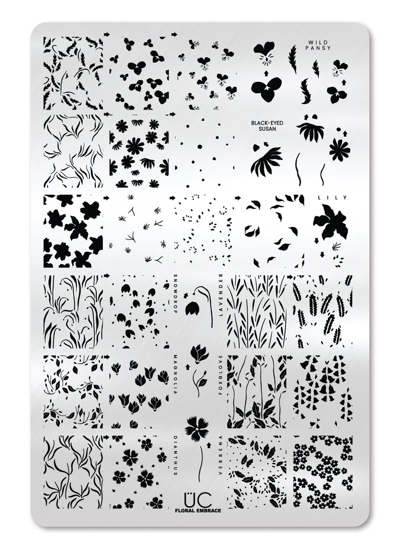 A beautifully designed floral print plate that is sure to satisfy any floral pattern you're after. We added slightly larger, coordinating single flower layers along the side and down the middle. Flower names are also on the plate so you'll know what you're stamping. Flowers include: Wild Pansy, Black-Eyed Susan, Lily, Snowdrop, Lavender, Magnolia, Foxglove, Dianthus and Verbena.