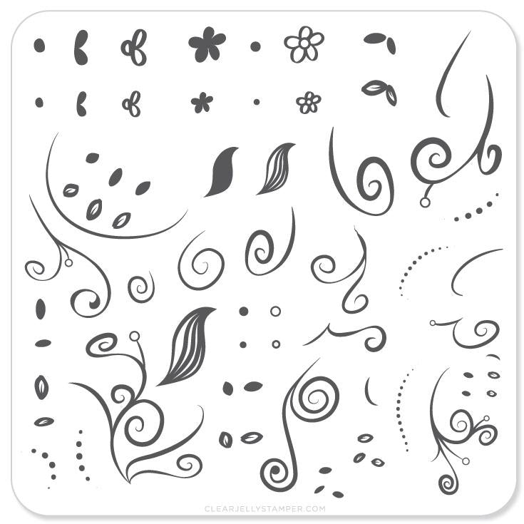 The Floral Swirl #1 nail stamping plate features nail art designs of swirls and various flower parts. This nail stamping plate allows the user to create multi-layered and multi-colored nail art designs with ease.
