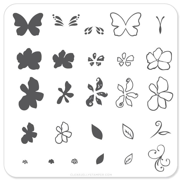 The Flower & Butterfly nail stamping plate features a butterfly and various floral nail art designs that allows the user to create multi-layered and multi-colored nail art designs with ease. Layer until your hearts content!