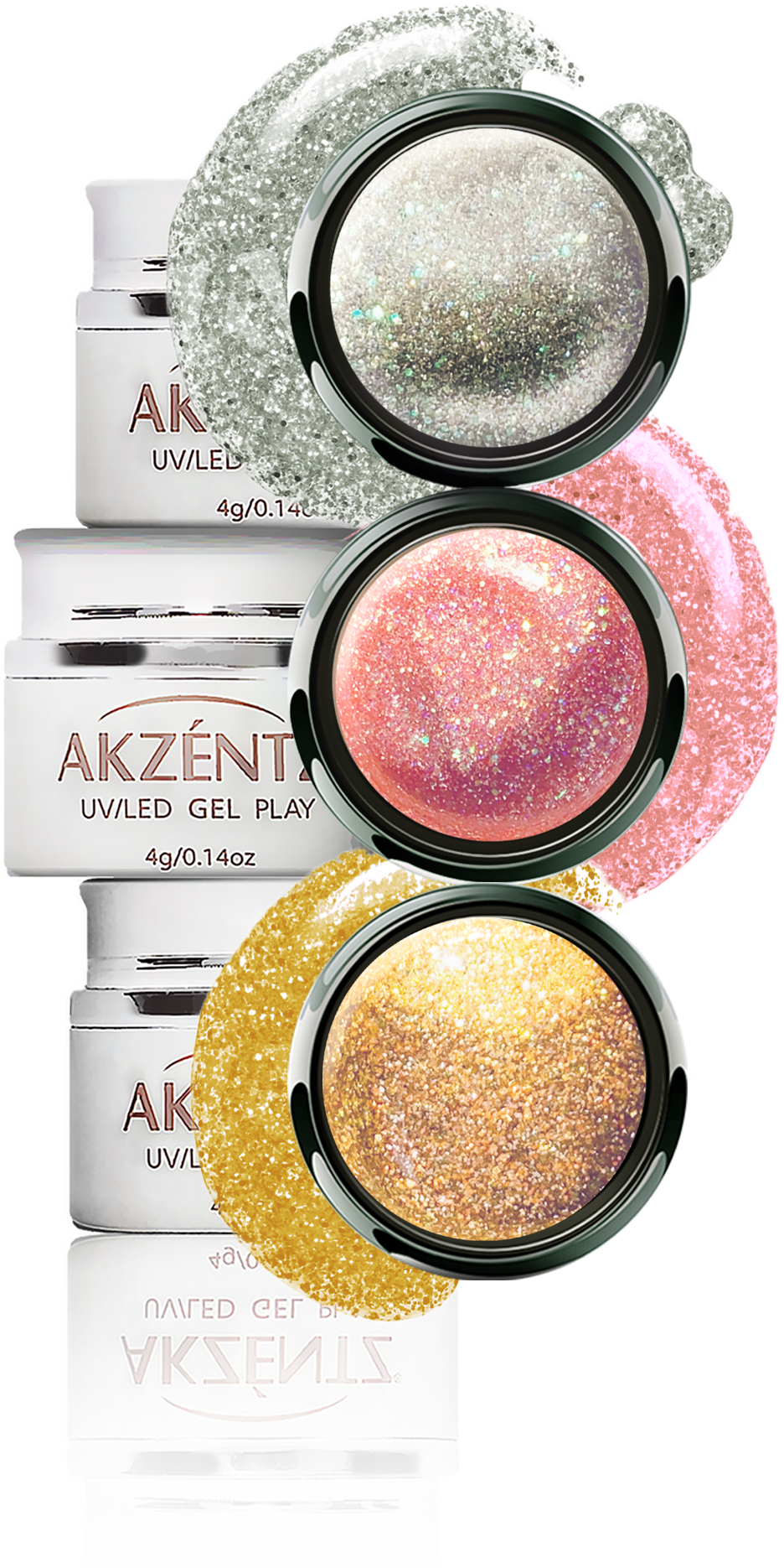 Gel Play Paints – highly pigmented colours designed for fine detailed nail art. Gel Play Glitters – shades of vibrant, heavily pigmented glitters. Gel Play Glitter shifters - sparkling glitters that shift their tone depending on base colour. |