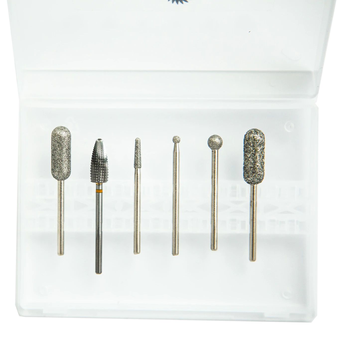 Included are the Orange Crush fine to remove gel polish without damaging the natural nail. Next are a coarse and fine callous bit, one for reducing callouses and one for refining and smoothing. Three cuticle bits for the cleanest cuticles, getting into tight spots and small callouses.