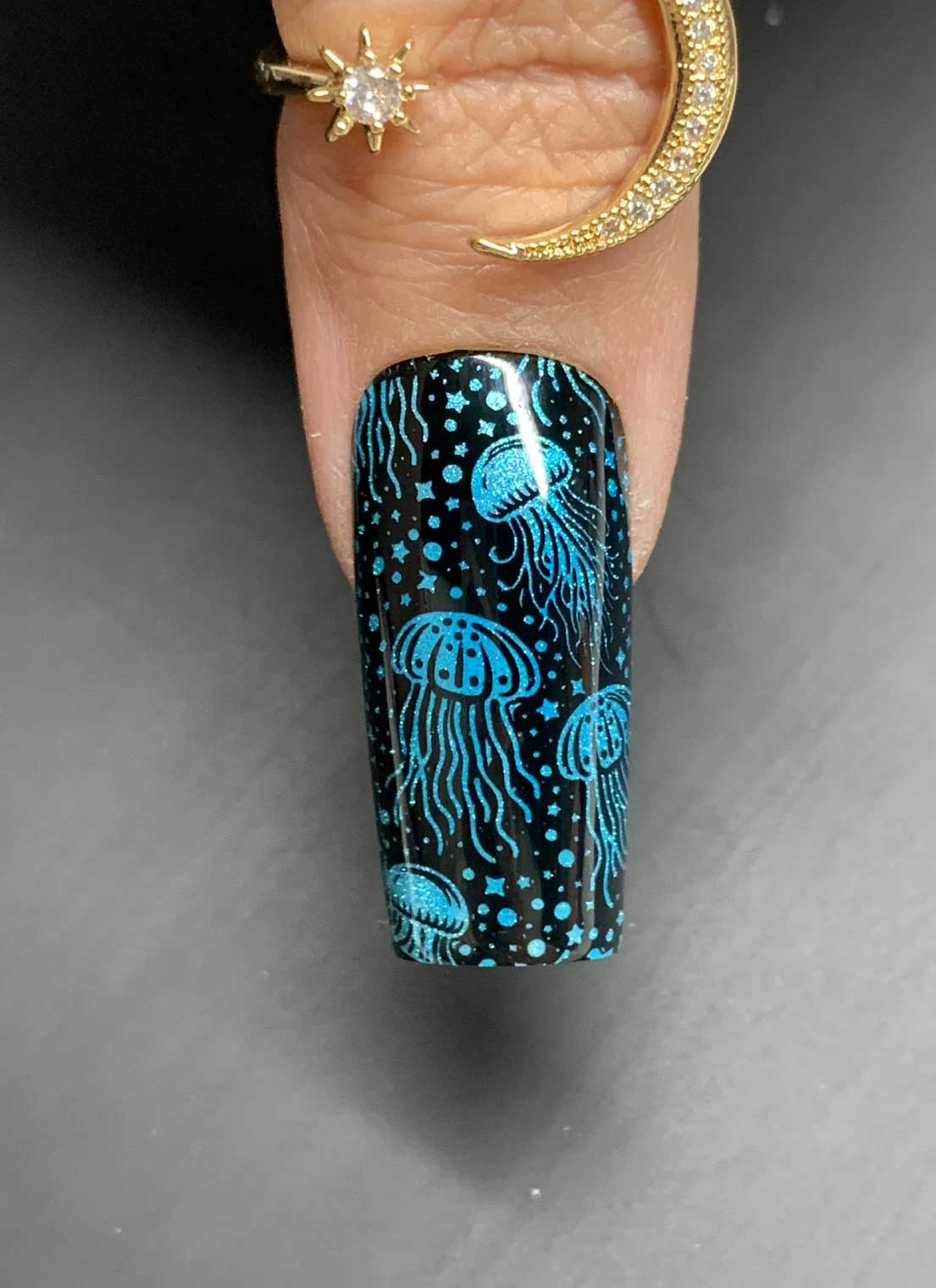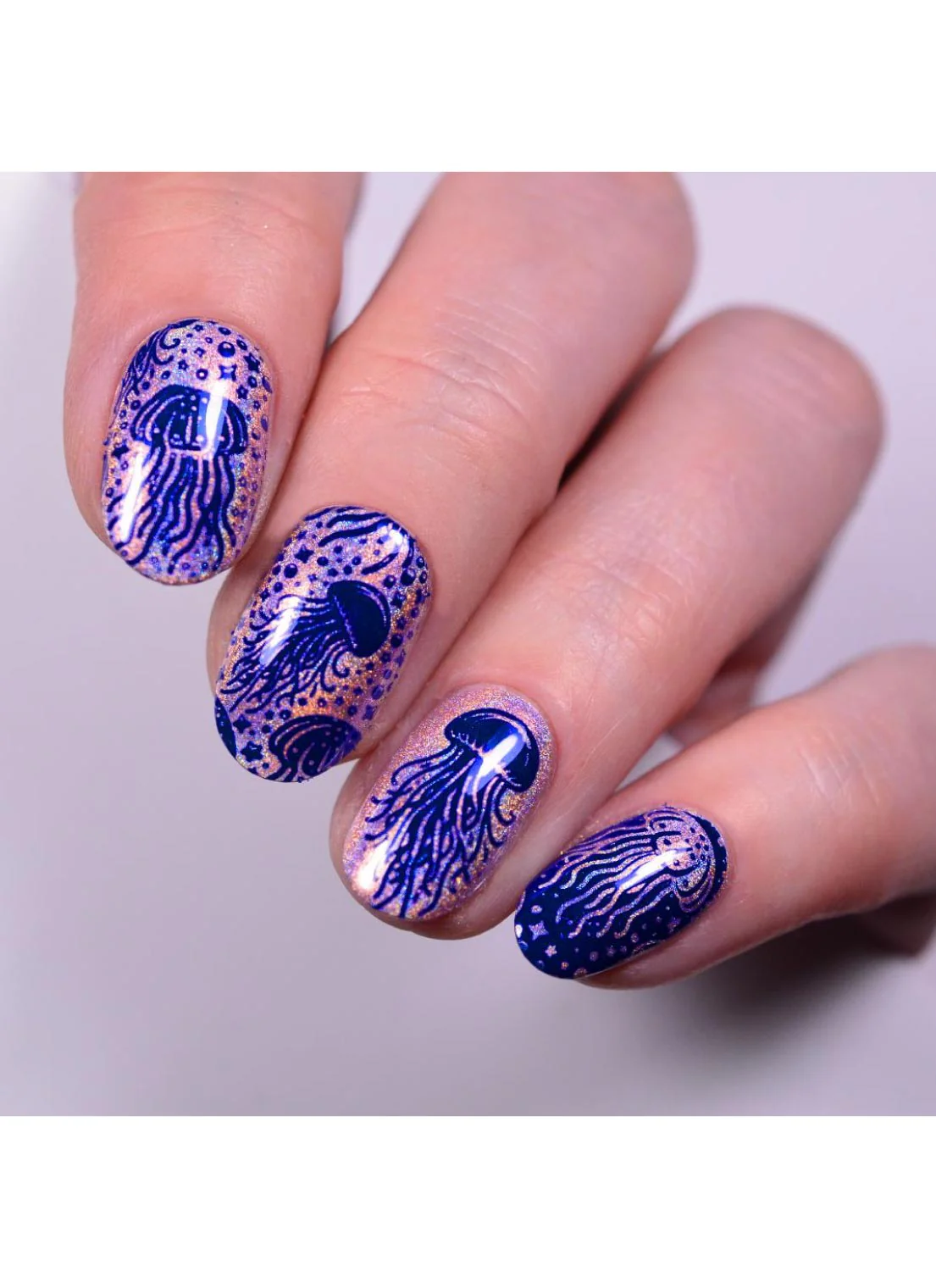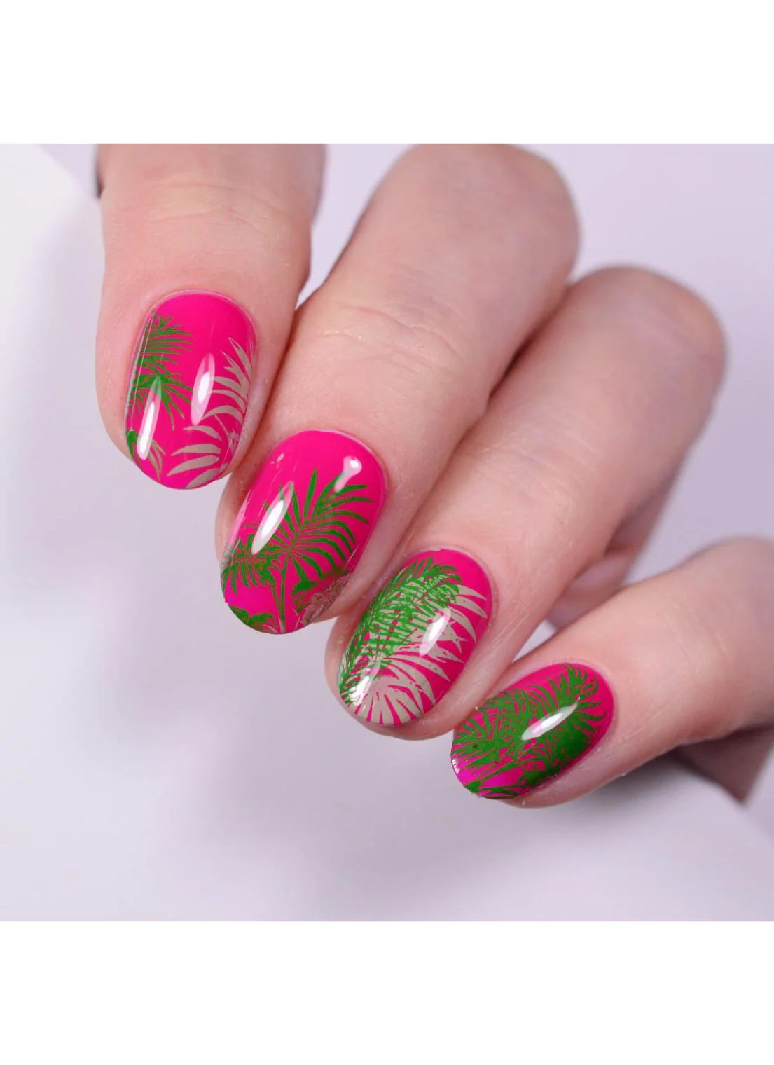 This plate is 9.5 cm by 14.5 cm and has coordinating single images down the center and a few on the sides. Most designs are 17 mm x 21 mm and are built to cover edge-to-edge on even the largest natural nail size. Are small nails left out? Never! Our designs are crafted to not be so overwhelming or large that you can't see what is on your nail - even if it's tiny!