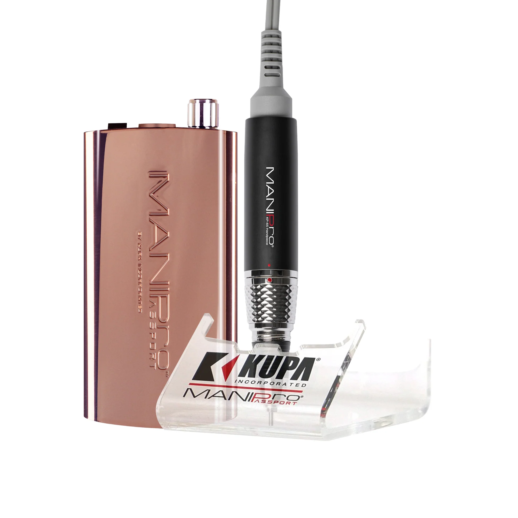 This powerful, portable electric nail file has been designed for the Professional Nail Technicians who demand power and portability. The MANI-PRO Passport® Control Box features a light weight battery powered *Acetone Resistant Finish* control box. This unit can provide anywhere from 8 to 10 hours of use per charge in either 110v or 220v. The MANI-PRO Passport® comes complete with a stainless steel belt clip and a plastic handpiece holster which can snap on either side of the control box. Full one year parts and labor warranty with your Kupa E-file Control Box!