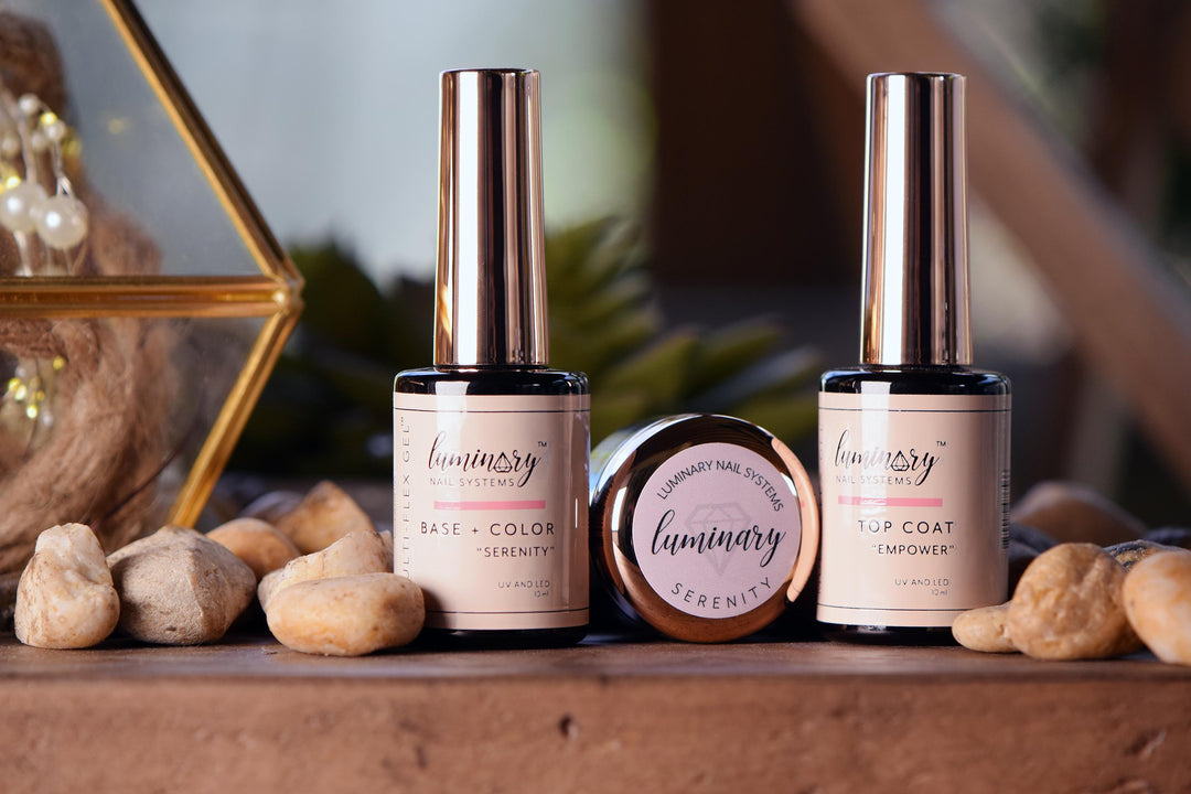 Luminary Nail Systems was designed with the intent of making nail tech's lives easier. Our Starter Kit comes with the basics for creating a beautiful structured manicure - a 10ml with brush for application, a jar with the same gel for grabbing larger beads to build structure, and an Empower No Wipe Top Coat for a glossy finish. Commit Primer is sold separately.