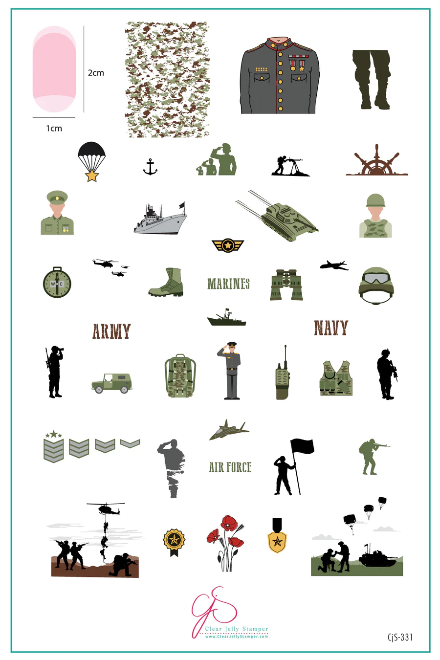 Introducing the Military CjS-331 Steel Nail Art Layered Stamping Plate, a remarkable nail art plate designed to pay homage to the bravery and dedication of our armed forces. This stamping plate offers a rich tapestry of military-inspired designs, including finely detailed images of soldiers, powerful tanks, and the national flag, making it perfect for creating patriotic nail art that exudes pride and patriotism. With representations from both the army and navy, this plate is versatile, allowing you to honor various branches of the military. The full-coverage designs ensure your nail art will be vibrant and captivating, featuring helicopters and uniform patterns to add a modern and cohesive touch. Whether you want to celebrate and commemorate special military events, craft striking camouflage-inspired nail art, or pay tribute on Veterans Day and Remembrance Day, this stamping plate is your canvas to express support and admiration for our armed forces in a beautifully artistic way.
