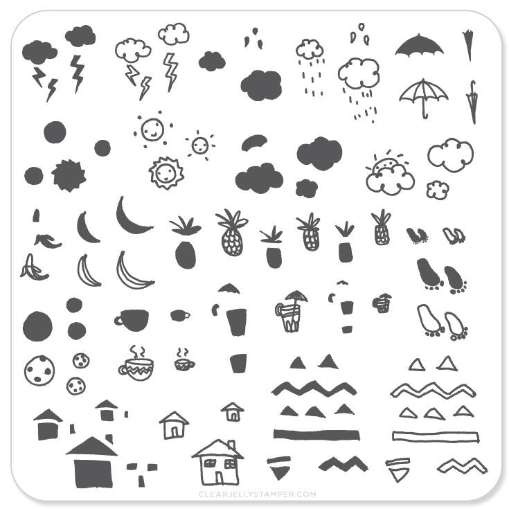 MINI Summer Drinks, Fruits & Sky Doodle; which, is a doodling inspired plate that gives the impression of "hand-drawn" artwork. We are creating a series of doodle impressions because we think they're darn cute & fun! MINI Summer Drinks & Fruits Doodle is a "summer fun" themed plate and features; bananas, pineapples, coffee drinks or tea, fruity cocktails, bare feet, buildings (of corse!) and cookies! These plates are the same images as on our other Doodle plates... just smaller!