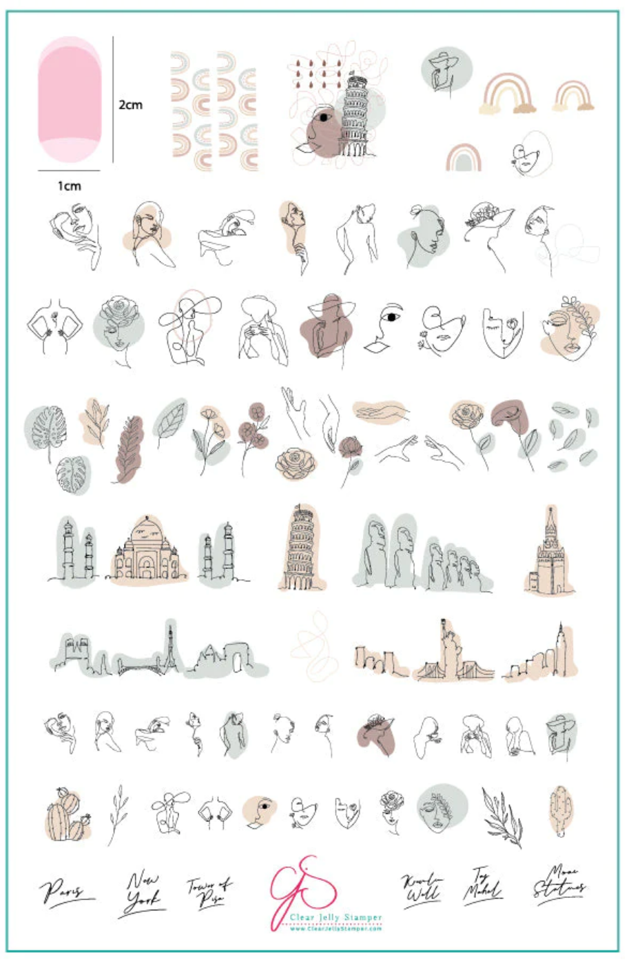 Travel the world in a single line! From Paris to New York, to the Tower of Pisa and the Taj Mahal, elegant modern lines and images adorn this mod-life nail art plate. Safe Travels!