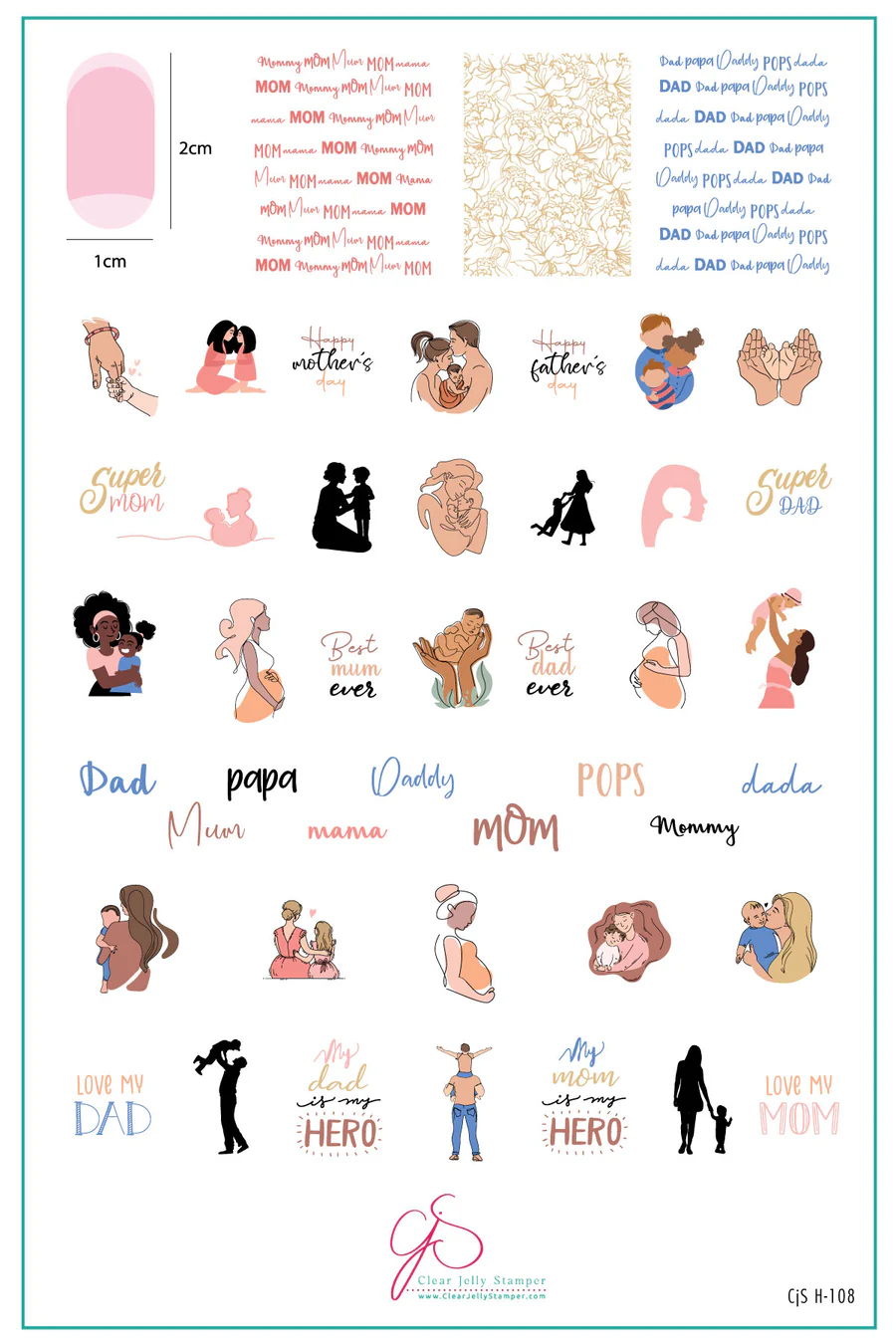 Introducing Clear Jelly Stamper's heartwarming steel nail art layered stamping plate, CJSH-108, "Mom & Dad's Day." This delightful plate represents the bond between parents and children, celebrating the cherished roles of both super moms and super dads. With endearing motifs like "Super Dad" and "Super Mom," as well as phrases like "Love My Dad" and "My Dad is My Hero," this plate captures the essence of gratitude and admiration. Perfect for celebrating special occasions like Mother's Day and Father's Day, it features heartfelt sentiments that include "Happy Mother's Day" and "Happy Father's Day," ensuring every manicure is a loving tribute to parental love. From tender moments like holding hands and family hugs to the joys of pregnancy, babies, and children, this plate beautifully portrays the journey of families, capturing the essence of love, warmth, and togetherness. Let CJSH-108 "Mom & Dad's Day" be your tool for expressing gratitude and celebrating the extraordinary bond between parents and children through nail art that speaks from the heart. Maternity and baby images, amazing for a baby shower!