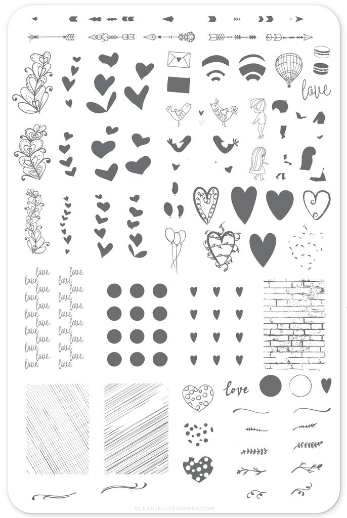 Adorable and sweet plate with endless possibilities (Yes... like all our other plates). Cute little guy and girl... one for each nail when popped together are holding hands! Awwwwwww... Fantastic backgrounds... stacks of hearts-literally!