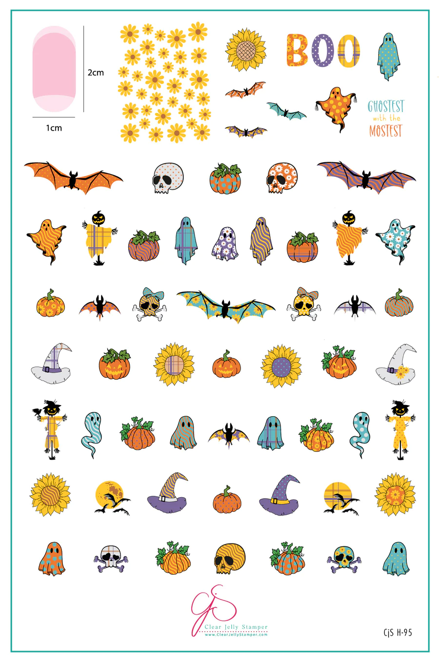 Goblins pop in to say hello, their patterns as mischievous as their grins. It's a parade of playful Halloween characters, all decked out in their patterned best. And with the CjSH-95 plate and a clear jelly stamper, you have the tools to create your perfect Halloween mani – a masterpiece of patterns that's as unique as you are.