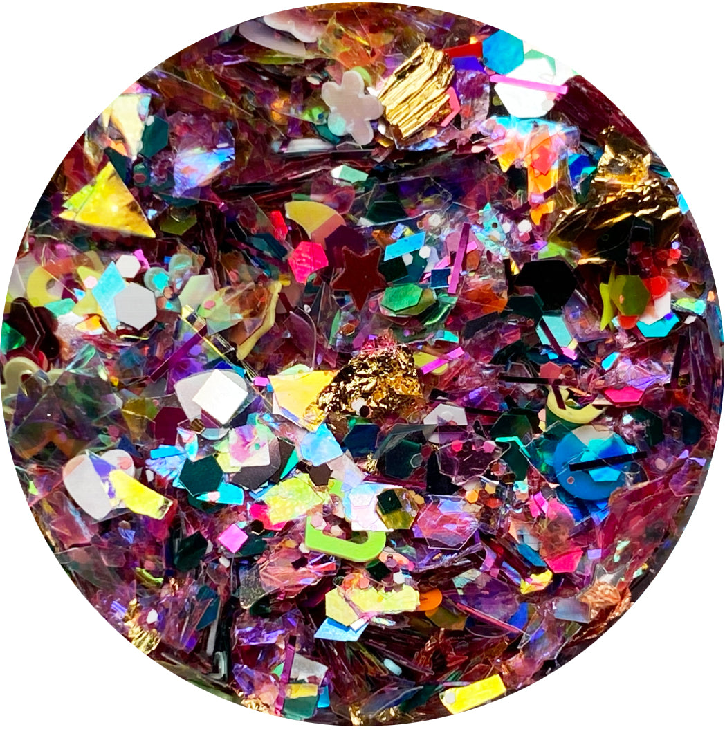 Mix of lots of sizes and shapes and colors of glitter. Chunky super shiny glitter and mylar pieces to encase in gel or acrylic.