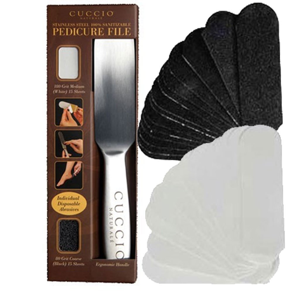 This stainless steel, 100% sanitizable pedicure file comes with 15 white 180 grit and 15 black 80 grit disposable, water-resistant refill sheets. The ergonomic design of the file's handle provides firm grip and leverage.