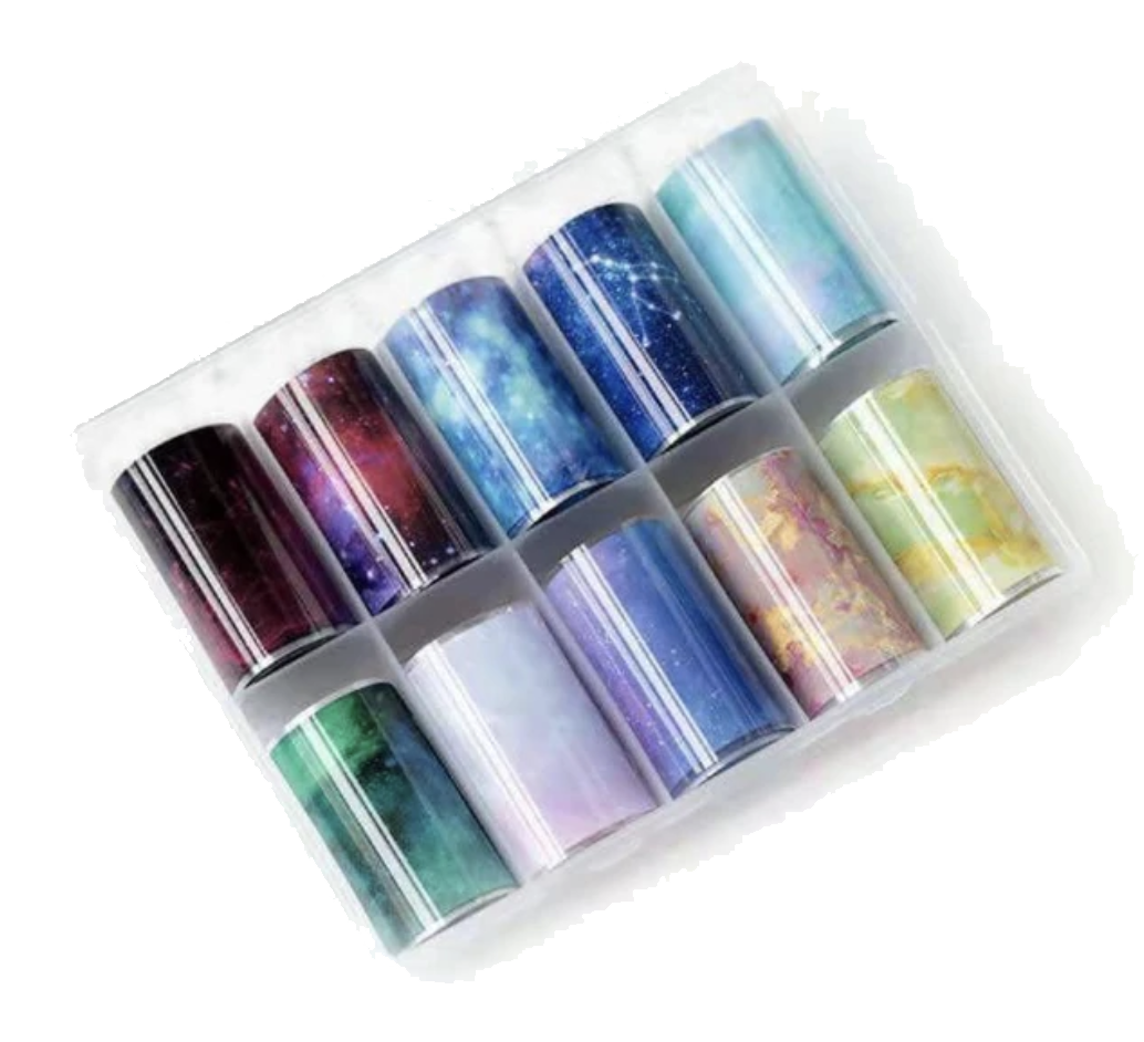10 pcs. of ultra thin easy to transfer foils of the night sky including one with constellations! Marble effects also included in this set.