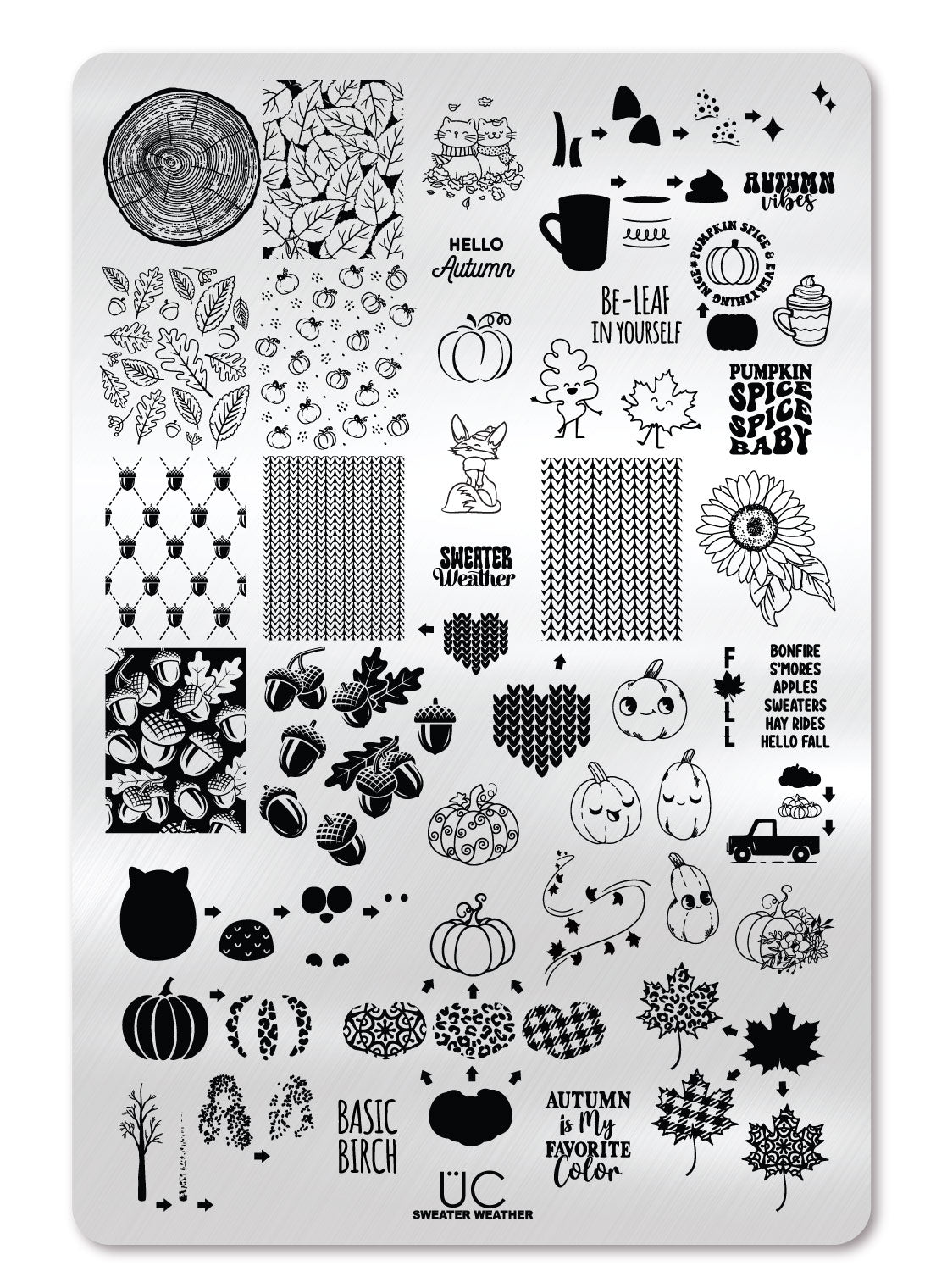 Get all the fall feels with our all new plate! From cuddled up kittens to an adorable fox with a scarf to two leaves that encourage you to be-leaf in yourself. With layerable pumpkins and leaves you can create ridiculously cute nails like Leopard print pumpkins, plaid pumpkins and more! And did we mention the fall truck with pumpkins in the back?