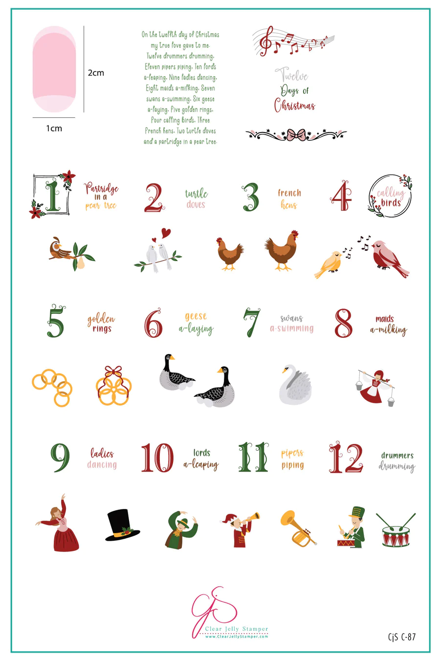 Indulge in the festive spirit of the holiday season with the CjSC-87 "Two Turtle Doves" Steel Nail Art Layered Stamping Plate, a joyful tribute to the classic song "The Twelve Days of Christmas." This plate encapsulates the whimsy and charm of the cherished carol, featuring each of the twelve days in delightful detail. From the very first day with "a partridge in a pear tree" to the iconic "two turtle doves" and beyond, the plate beautifully portrays all the symbols of the song, including "three French hens," "four calling birds," "five golden rings," and so on, all the way up to "twelve drummers drumming." It's a whimsical journey through the beloved lyrics, allowing you to celebrate the holiday season with a nail art masterpiece that's both traditional and enchanting. "Two Turtle Doves" is the perfect plate to immerse yourself in the magic of this timeless Christmas song, adding a touch of festive spirit to your nails with each unique design.