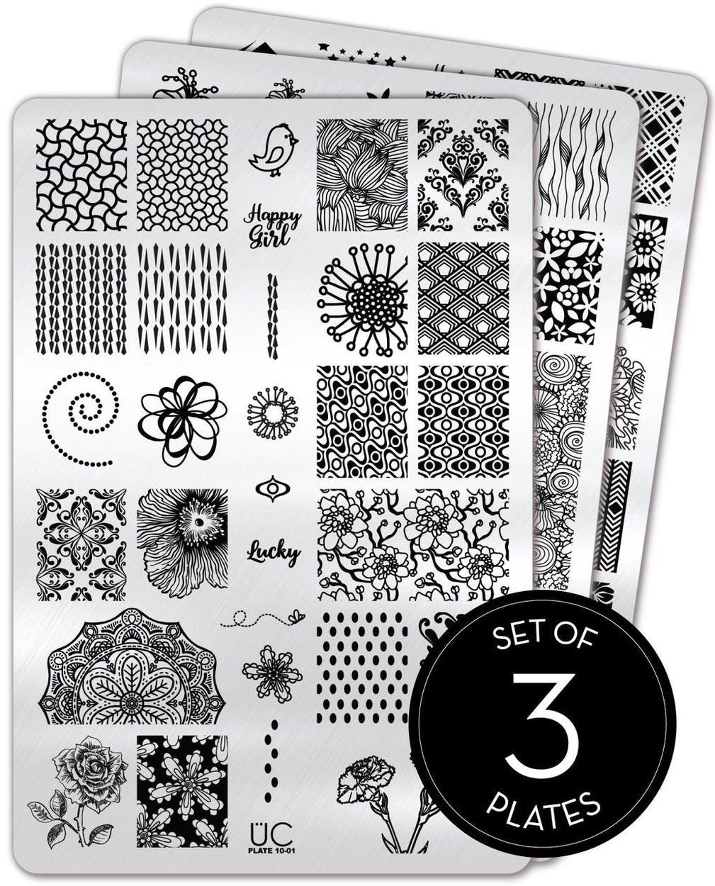 This Collection features three of our unique design plates carefully made to ensure almost any size nail is accommodated, it includes: UC 10-01, UC 10-02, and UC 10-03. Technical stuff: The size of each plate is 9.5cm by 14.5cm and the plates in this collection have coordinating single images down the center. The designs are engraved on the image plates and can be used over and over again - never wearing out.