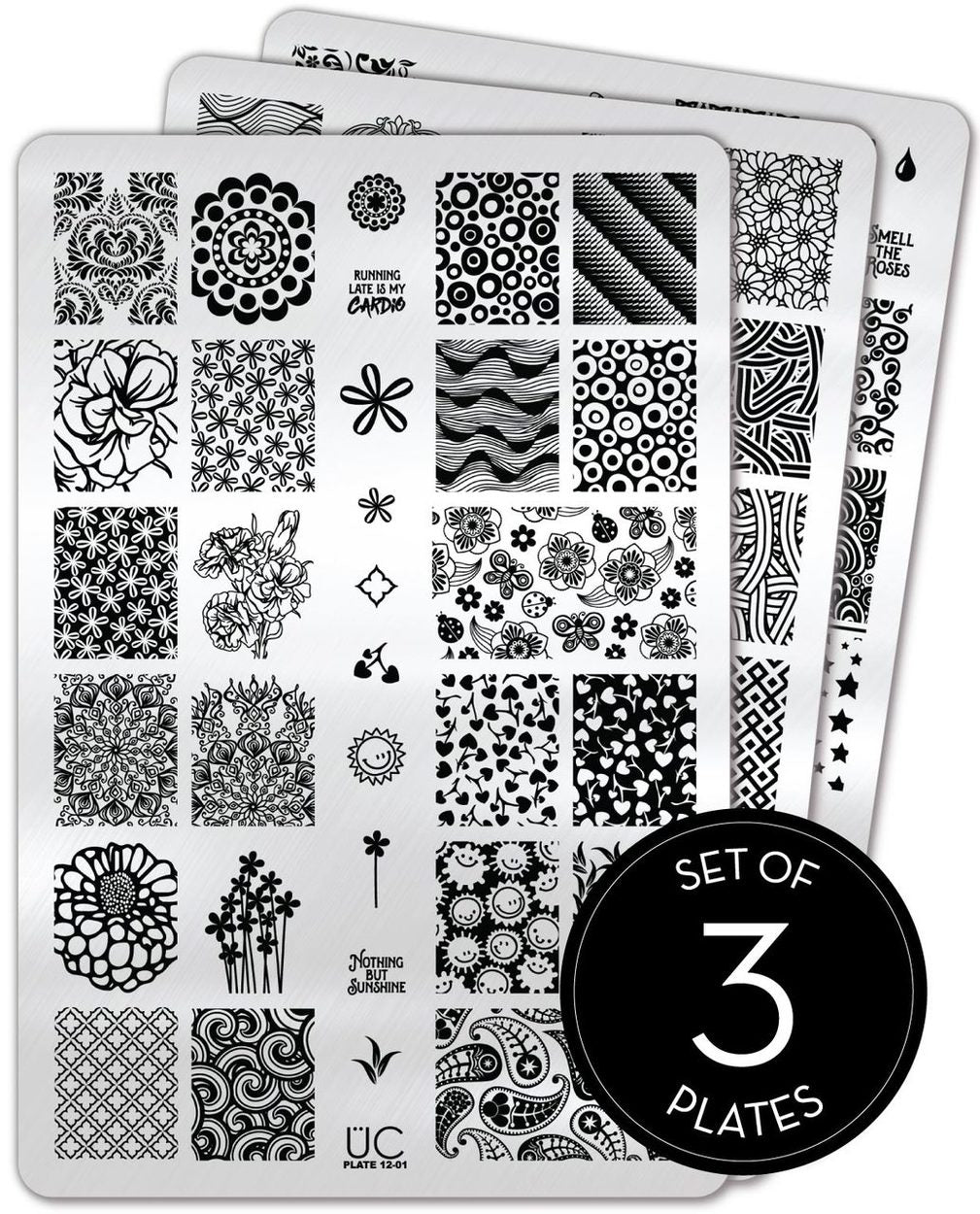 This Collection features three of our unique design plates carefully made to ensure almost any size nail is accommodated, it includes: UC 12-01, UC 12-02, and UC 12-03. Technical stuff: The size of each plate is 9.5cm by 14.5cm and the plates in this collection have coordinating single images down the center. The designs are engraved on the image plates and can be used over and over again - never wearing out.