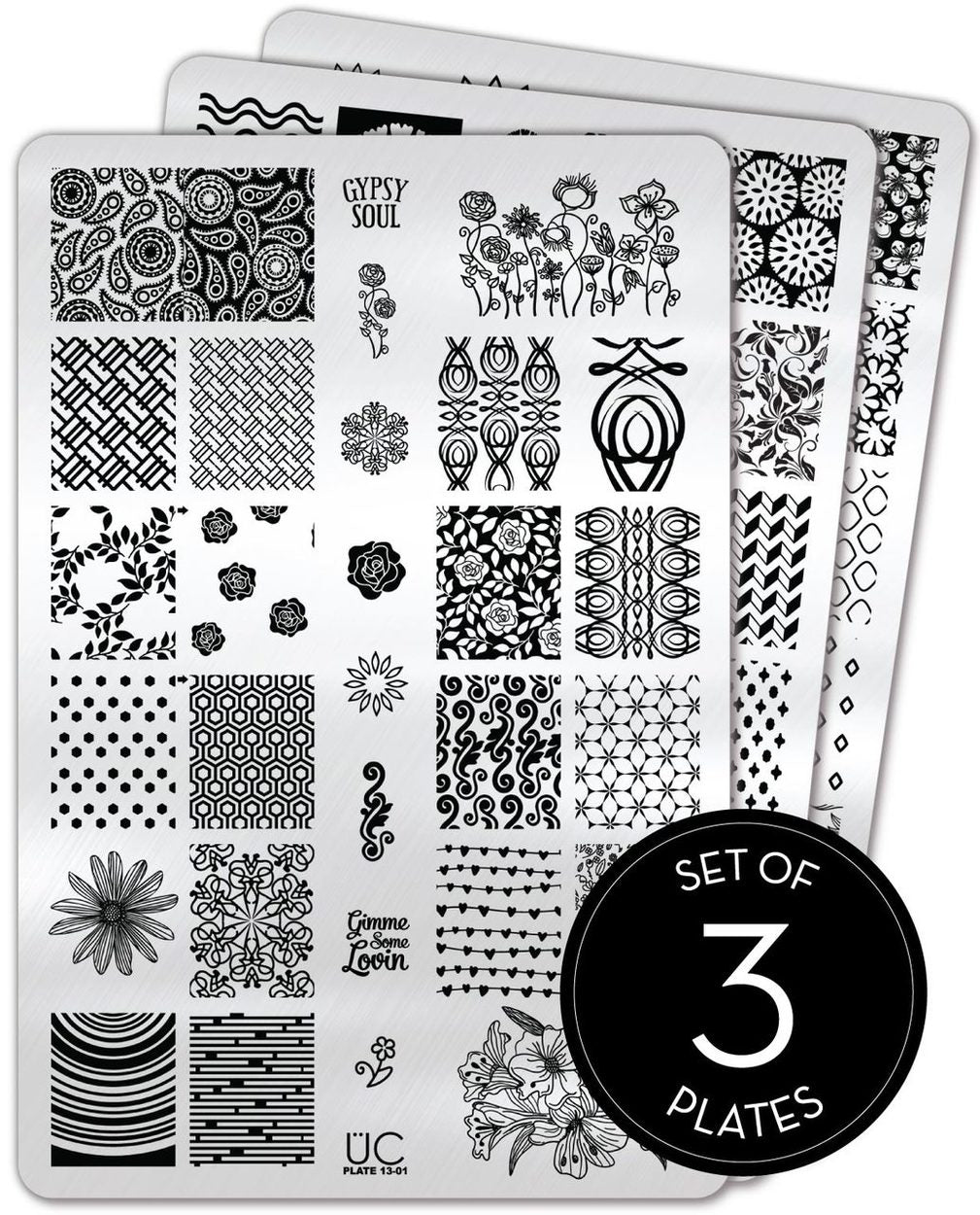 This Collection features three of our unique design plates carefully made to ensure almost any size nail is accommodated, it includes: UC 13-01, UC 13-02, and UC 13-03. Technical stuff: The size of each plate is 9.5cm by 14.5cm and the plates in this collection have coordinating single images down the center. The designs are engraved on the image plates and can be used over and over again - never wearing out.