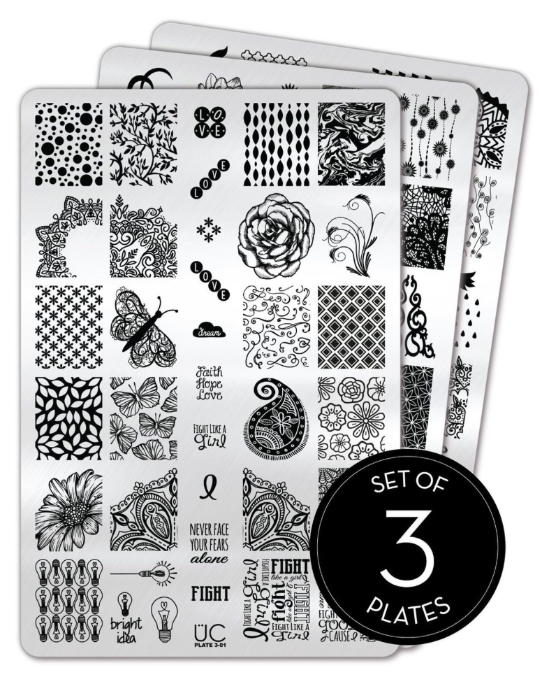 This Collection features three of our unique design plates carefully made to ensure almost any size nail is accommodated, it includes: UC 3-01, UC 3-02, and UC 3-03. The designs are 17 x 21mm - the largest single designs we know of in the industry - and are built to cover edge-to-edge even the largest natural nail size. Small nails left out? Never! Our designs are crafted to not be so overwhelming or large that you can't see what is on your nail - even if it's tiny!