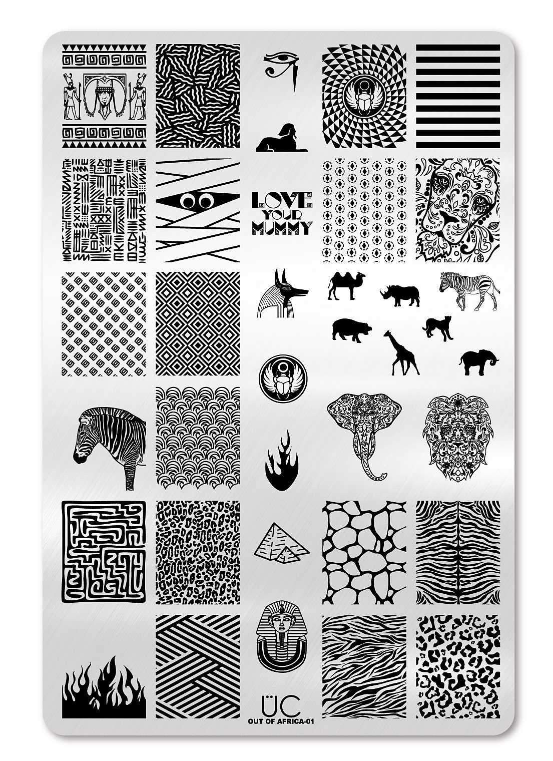 FIRE!! We just cannot get enough of the variety of designs in this nail stamping plate! From African Safari, to Egyptian goddess and even some wild animal prints - it's a masterpiece! This nail stamp plate truly has something for everyone. From big cat stripes to leopard spots - the animal prints alone make this one of our favorites! And then add on the additional animals, Egyptian symbols and monuments from the pyramid to the Sphynx.