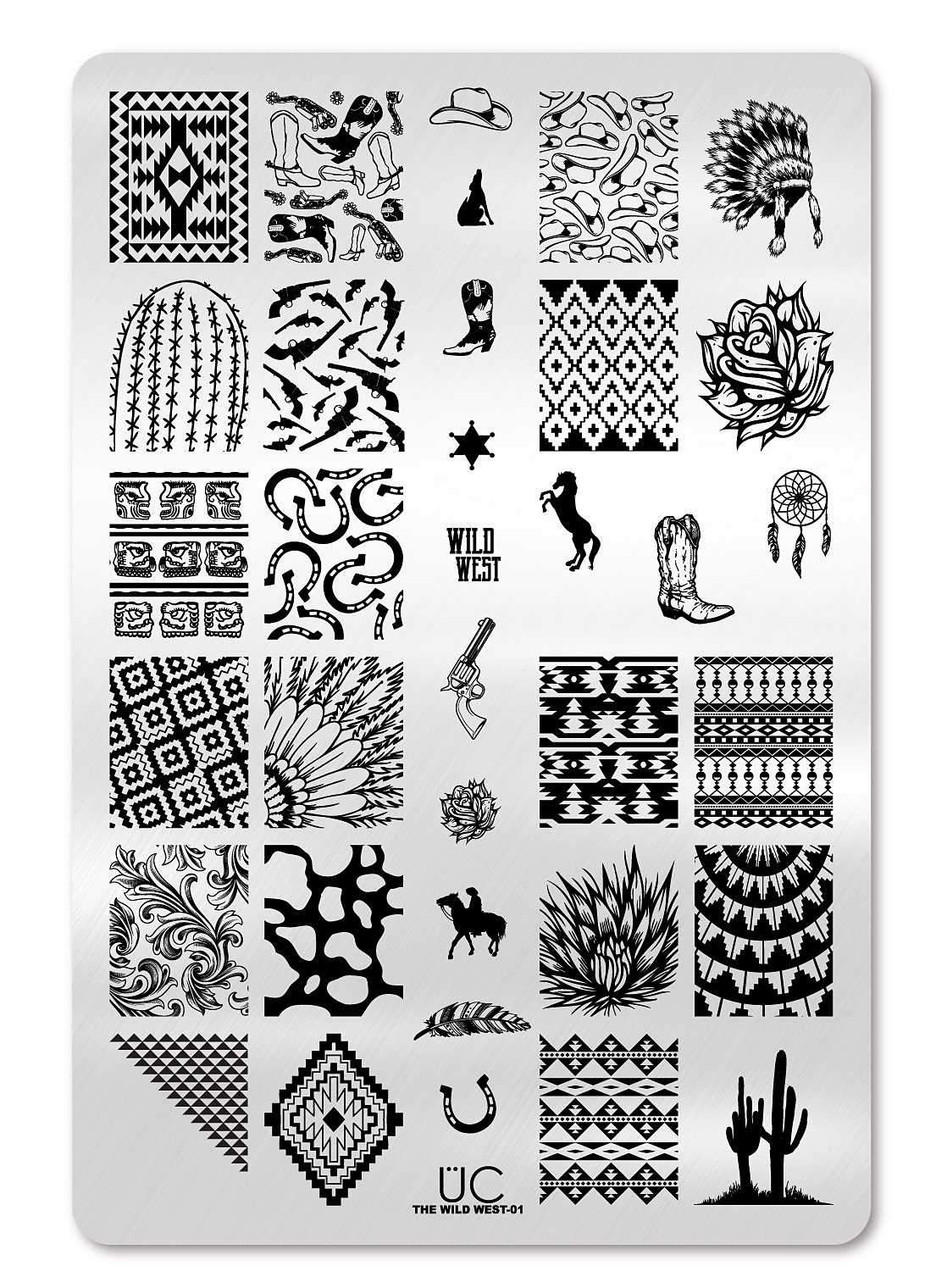 This nail art stamp plate is perfect for your inner cowgirl! Western and southwestern nail stamp patterns fill this adorable and unique nail stamping plate. And have you seen the mod cow-print? We're squealing with delight!