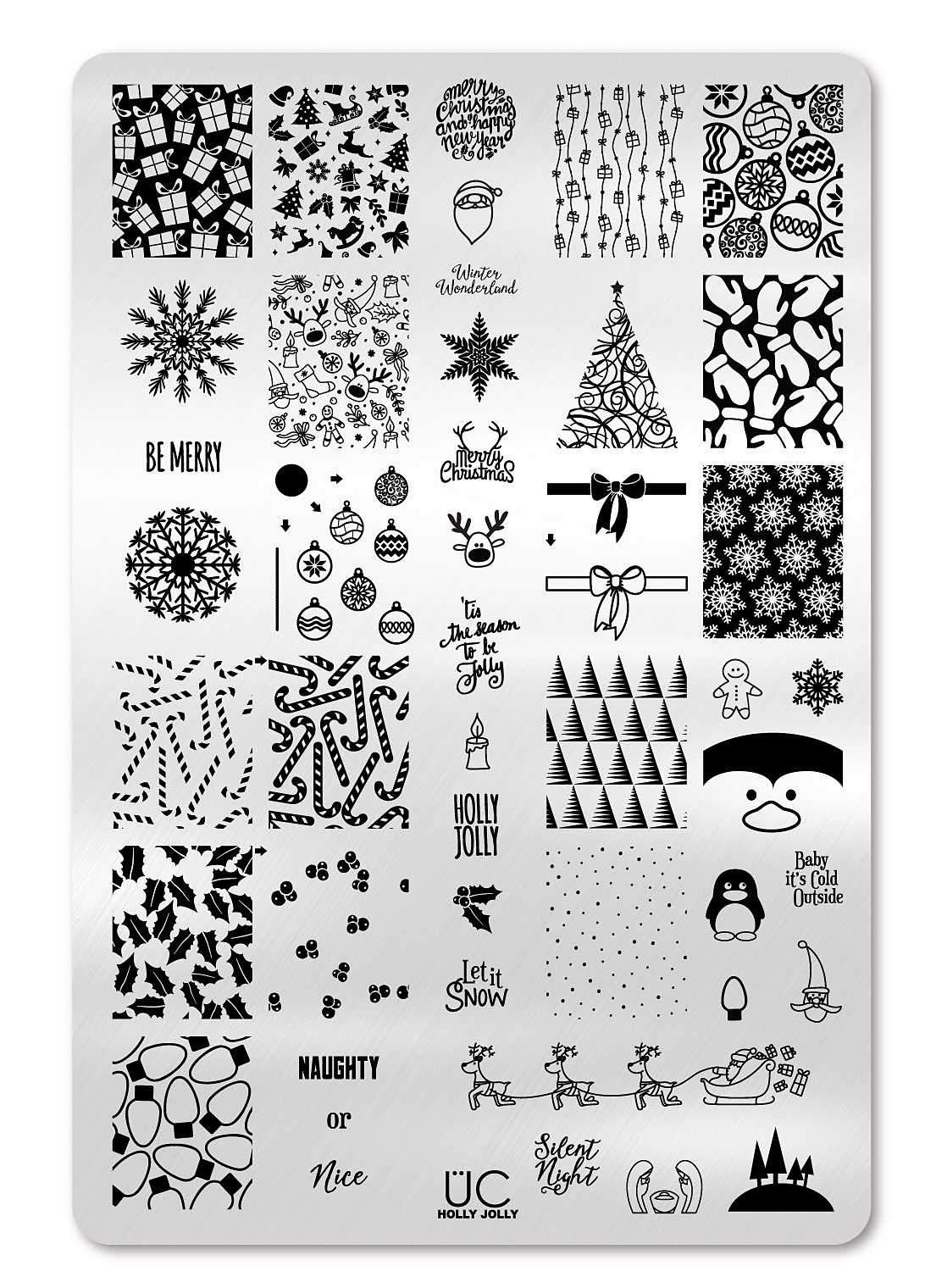 Bring on the hot chocolate, cozy fire and candy canes! Celebrate all the wonderful things this Christmas season has to offer and determine if you've been Naughty or Nice! Our Christmas nail art plate is perfect for getting in the festive mood with all the wrappings, ornaments and the cutest lil penguins you've ever seen. Find inspirational Christmas-themed nail art images galore on this plate and use it again year after year! Go holly jolly this year with holly and berries you can color-coordinate with ease.