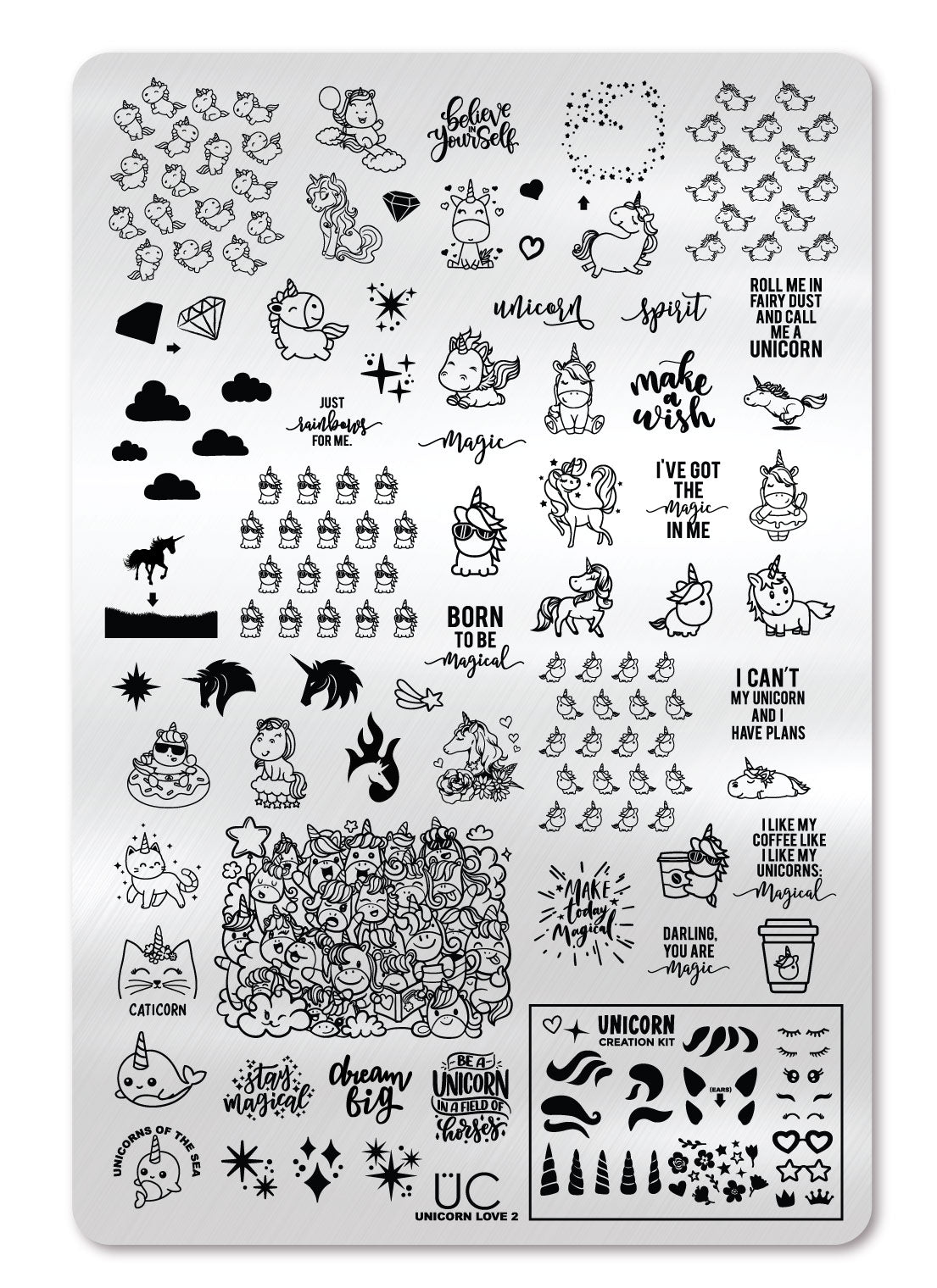 It’s the sequel you’ve been begging us for! If you want to make your mani magical - this plate is a must. We added loads of cute sayings like: “Roll Me in fairy dust and call me a unicorn”, “Make a wish”, “I’ve got the magic in me”, “I can’t my unicorn and I have plans”, “I like my coffee like I like my unicorns: Magical” and so many more! We even included a few atypical unicorns like the adorable narwhal (the unicorns of the sea) and the legendary caticorn! At the bottom right you’ll find a DIY Unicorn creation kit to make this plate extra magical.