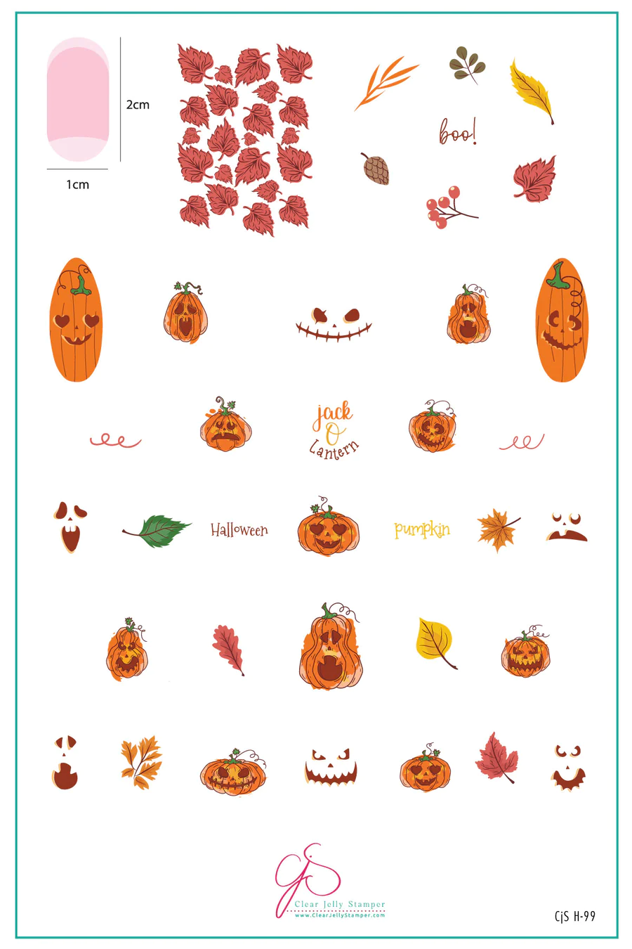 So grab your favorite fall shades, add a sprinkle of creativity, and let the CjSH-99 plate take you on a watercolor adventure. With jack-o'-lanterns, pumpkins of all shapes, sizes, and expressions, autumn leaves that practically twirl, a friendly "Boo!" to keep things lively, and a splash of fall colors that rivals the most vibrant sunset, your nails are in for a Halloween treat that's as sweet as candy corn and as playful as a pumpkin parade!