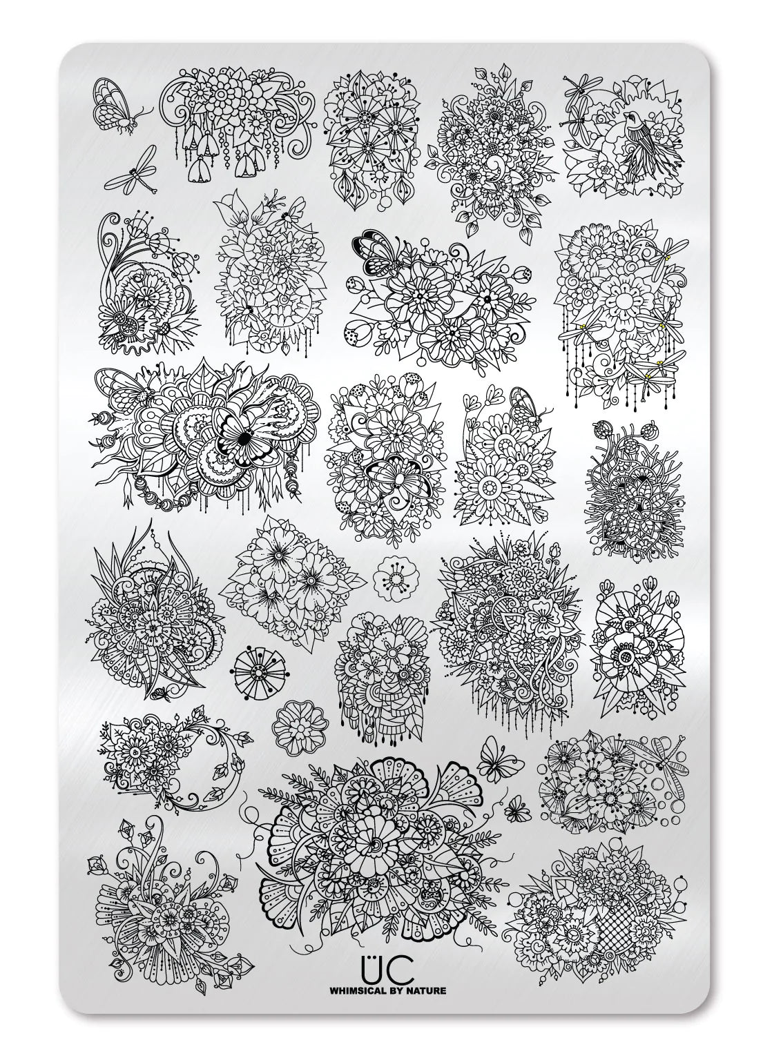 Our beautiful new addition to our plate library has so many unique qualities it’s hard to list them all. We wanted to make something that could not only be used in small sections but also could be draped over several nails at a time too. This plate works for large and small nails and creates the perfect reverse stamp canvas! From butterflies to dragonflies to the most ornate flowers we could find - this plate will quickly become your new relaxing go-to!