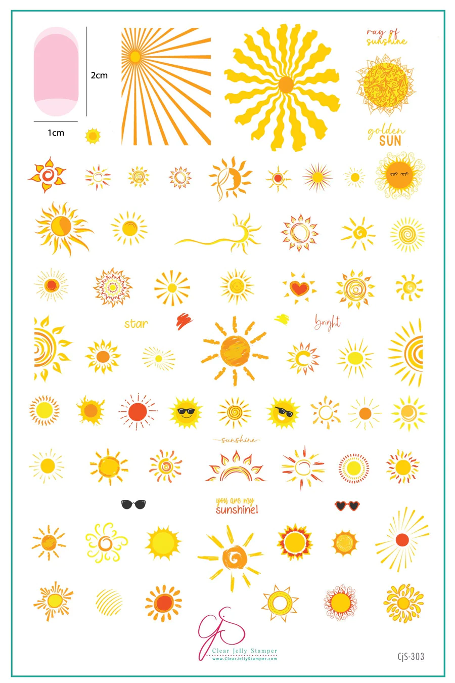 This steel nail art layered stamping plate - "You are my Sunshine" (CjS-303) - will brighten your day with layered designs of sunshine, sun, sunglasses, hearts, golden sun, a ray of sunshine, you are my sunshine, star, and other bright, happy shapes. Guaranteed to put a smile on your nails and your face!
